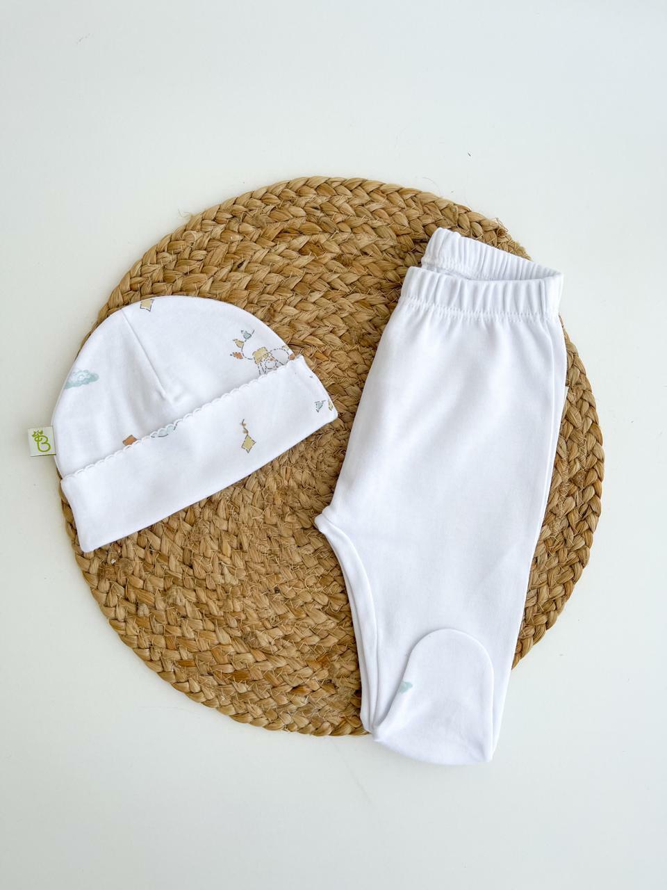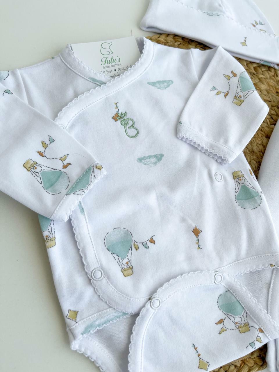 Ajuar de 3 piezas de algodón, con body cruzada, ranita y gorrito, estampa Patito, super lindo