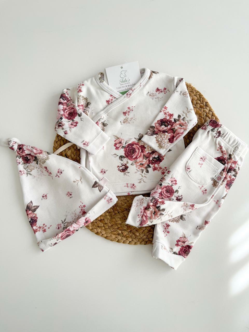 Ajuar de batita con pantaloncito y gorrito, de algodon con estampa bouquet
