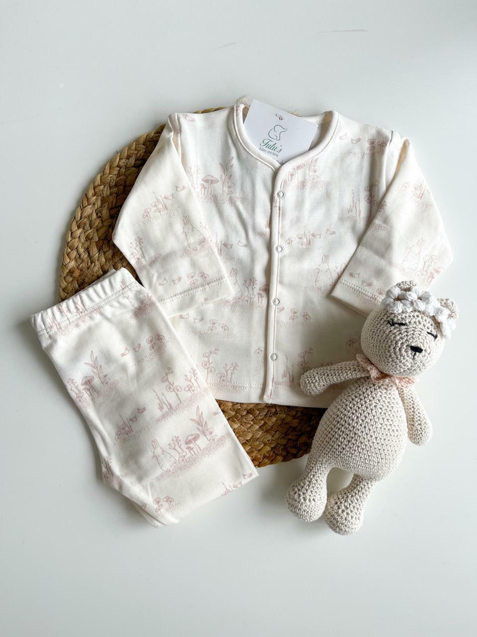 Conjunto de batita cruzada y pantaloncito estampa conejitos, de algodón pima, saquito con doble algodon, estampado por fuera, liso por dentro,