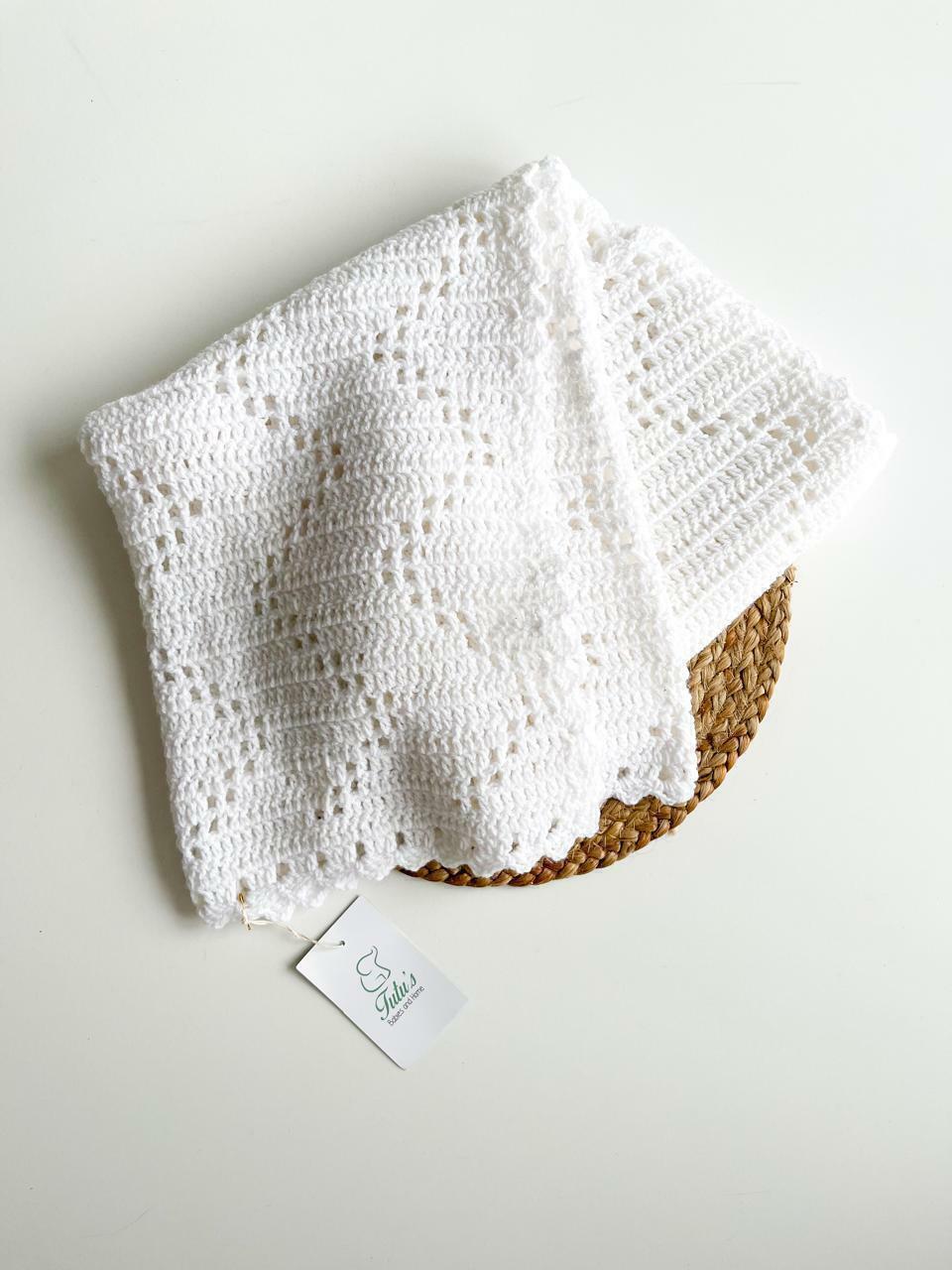 Manta tejida a mano, en color blanco, con terminacion de onditas con el mismo hilo de invierno, super linda! podes combinar con saquito o enterito de la misma linea,