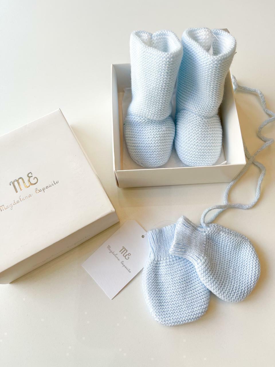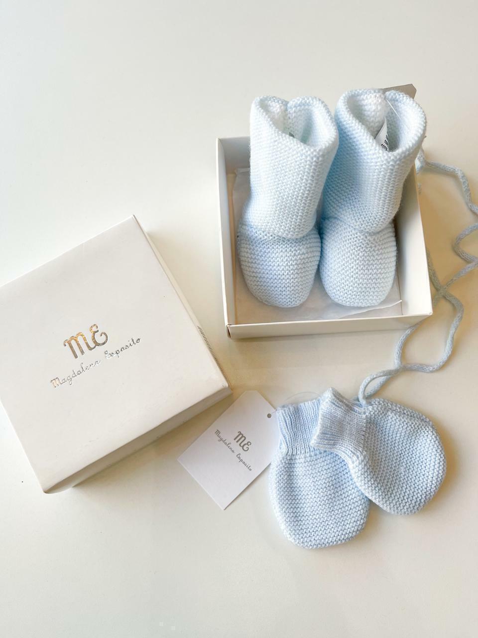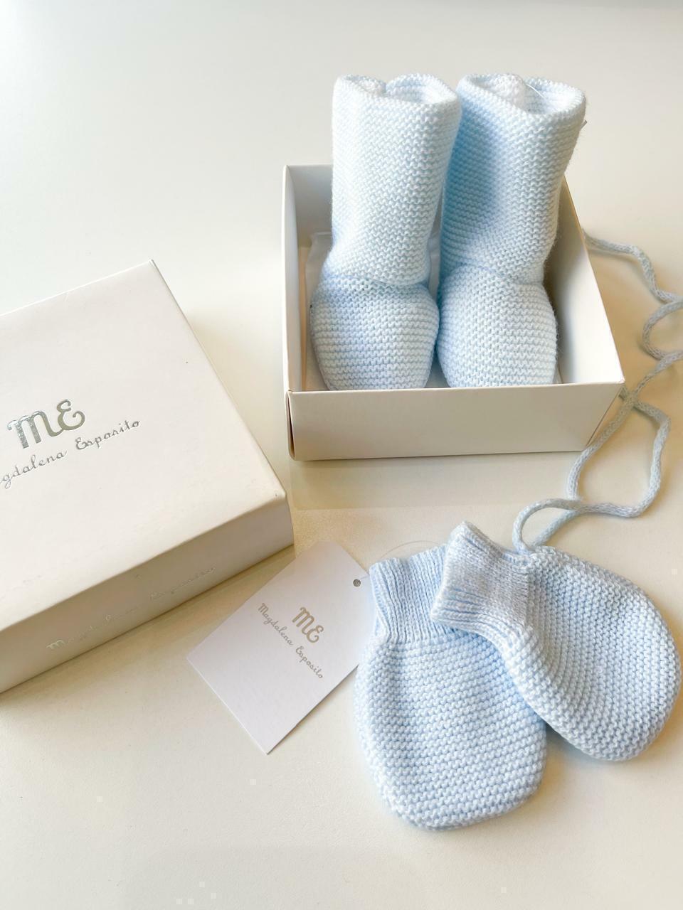Set de regalito, viene el par de botitas tejidas en santa clara y ademas los mitones combinando, ambos vienen presentados en cajita con papel seda, una opcion super linda y delicada