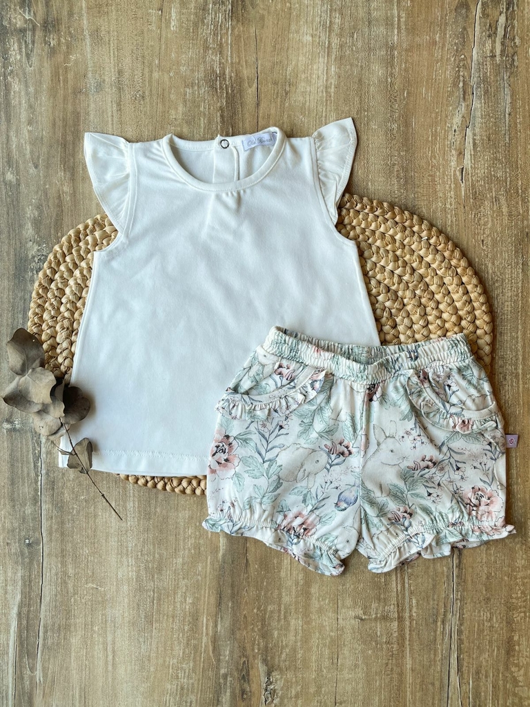 Shor con voladitos, estampa annie crudo, combinada con remera rosa con broderie