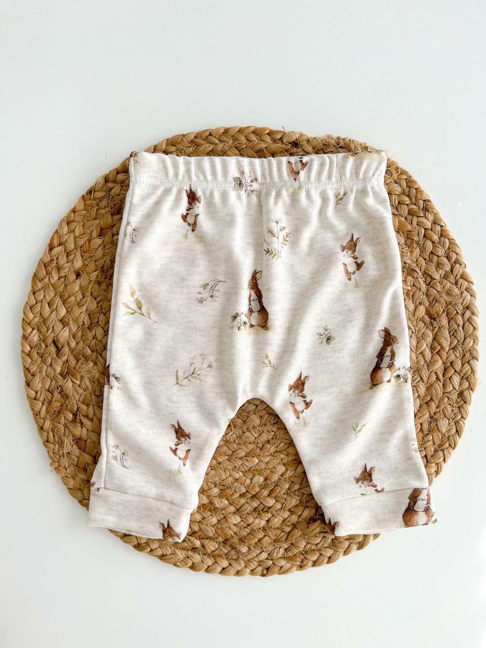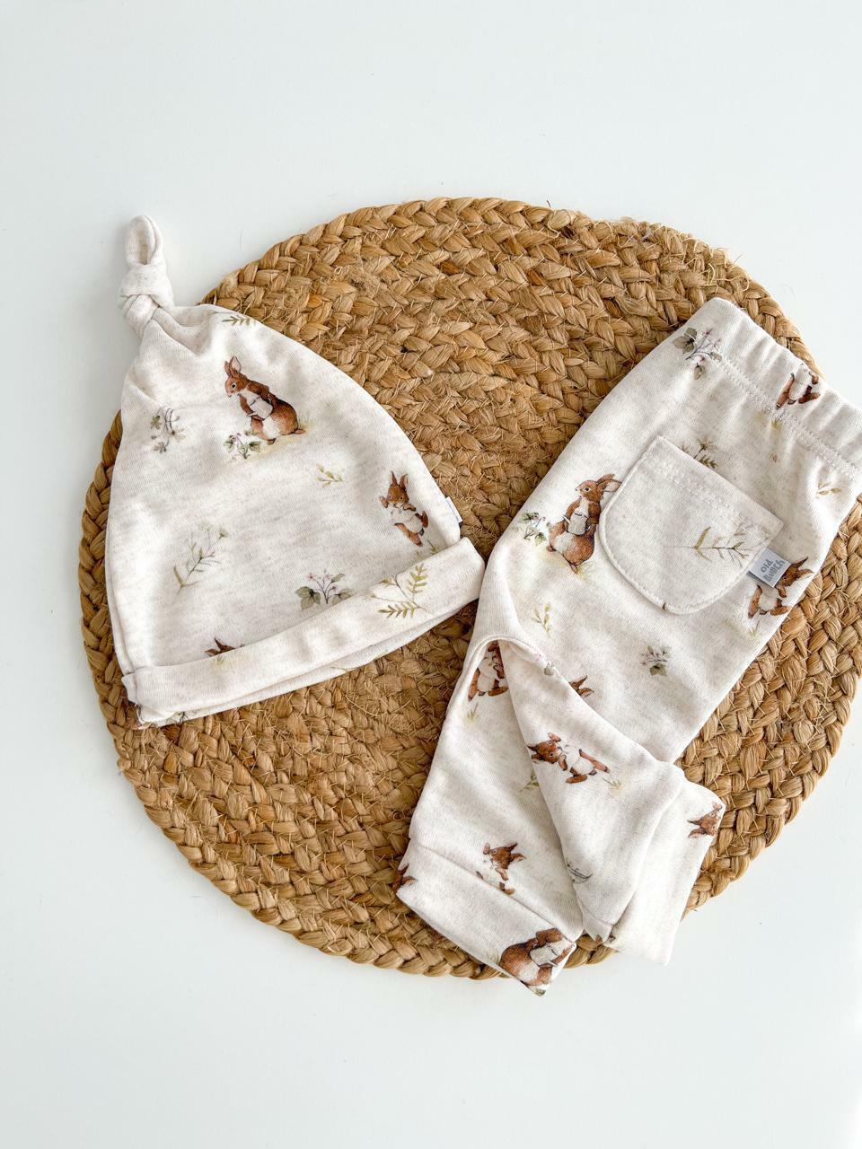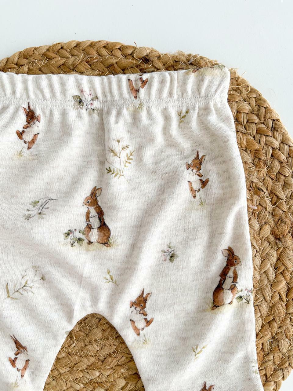 Ajuar de batita con pantaloncito y gorrito, de algodon con estampa conejito